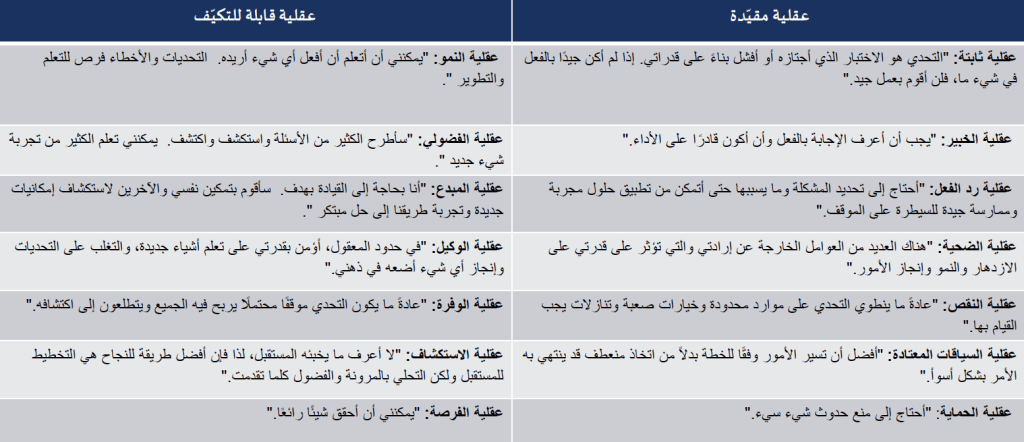 ما هي العقليات التي تساعد في بناء القدرة على التكيف والمرونة وتحسين الآداء؟